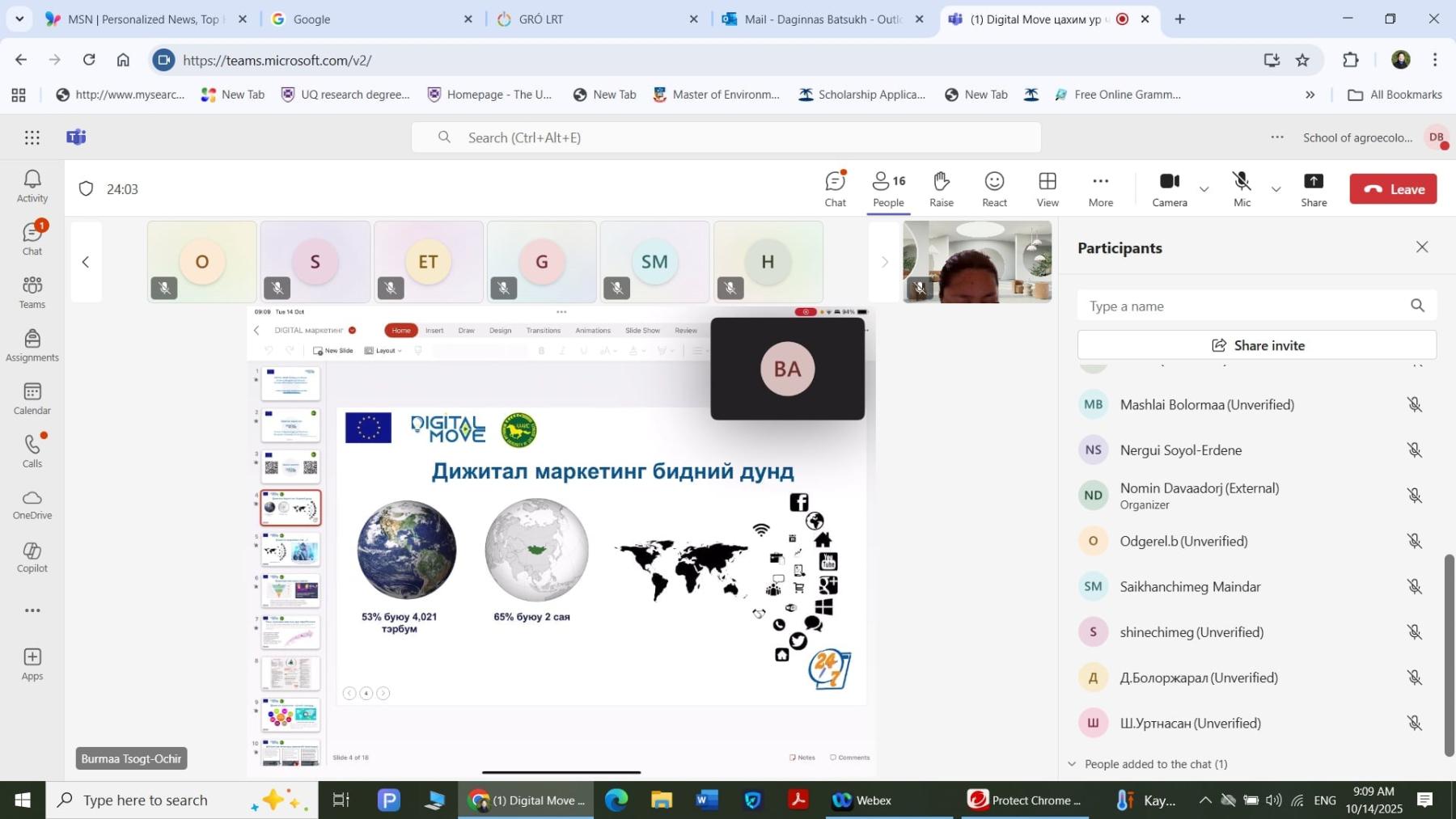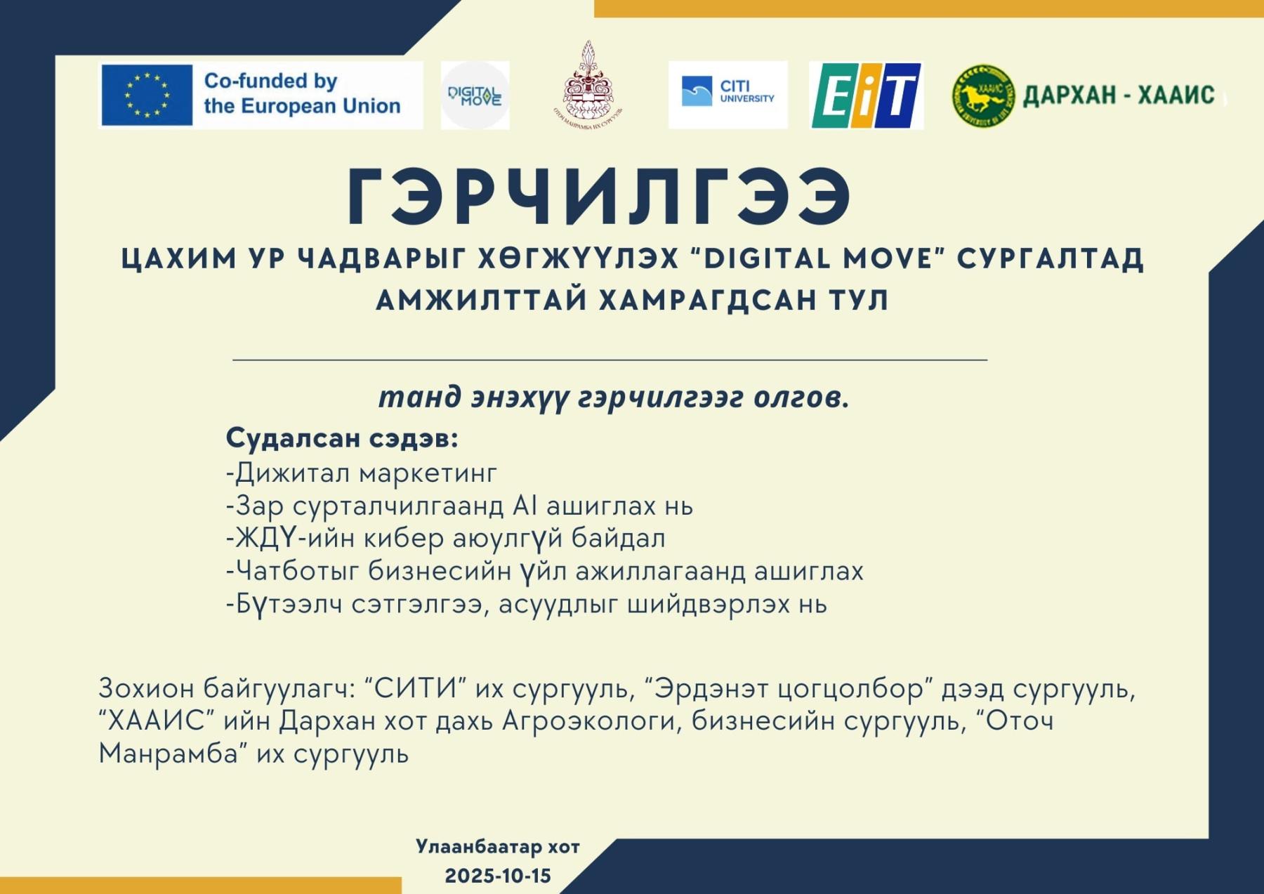 “Цахим шилжилт” төслийн ажлын багц 5-ын түгээн дэлгэрүүлэх явцын хүрээнд 2025 он 10 сарын 14, 15-нд жижиг дунд бизнес эрхлэгчдэд зориулсан онлайн сургалтыг Оточ Манрамба их сургууль, Сити их сургууль, Эрдэнэт цогцолбор дээд сургууль, Дархан-ХААИС-ийн багш нар хамтран амжилттай зохион байгууллаа. Тус онлайн сургалтад Манба дацан эмнэлэг, Манба дацан эмийн үйлдвэр, Манба дацан бусдад туслахуй хийд болон Оточ Манрамба их сургуулийн багш, эмч, эм зүйчид болон бусад ажилтнууд онлайнаар амжилттай оролцож сургалтын гэрчилгээг гардан авлаа.